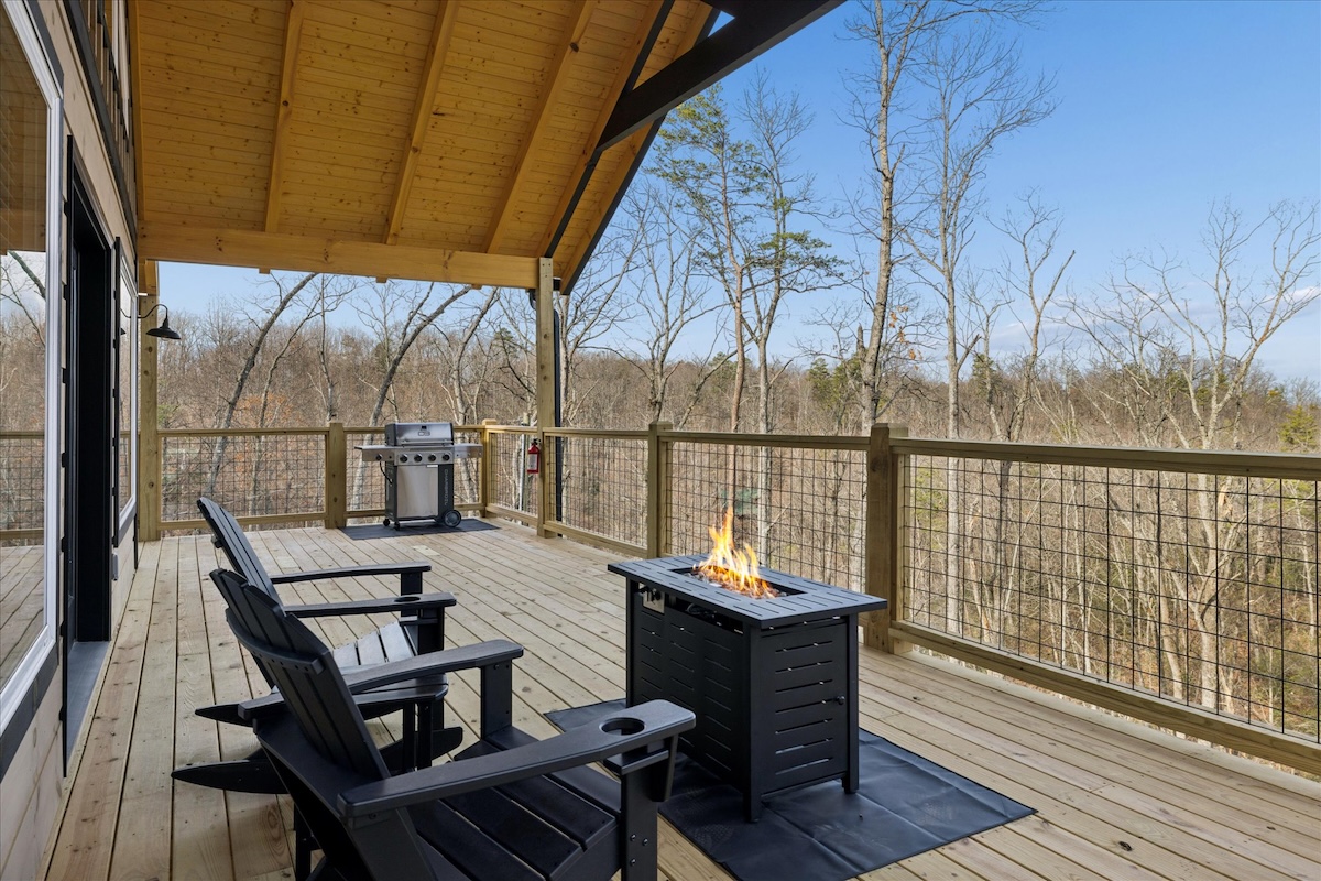 The main level features an inviting open-concept living area with a cozy fireplace, a fully equipped kitchen, and a dining space perfect for gathering together. Also on the main level is a half bathroom and a spacious master suite with a king bed and private ensuite bathroom. Step outside onto the main deck to enjoy the fresh mountain air, complete with a grill and outdoor fire pit—perfect for evening meals or relaxing under the stars.