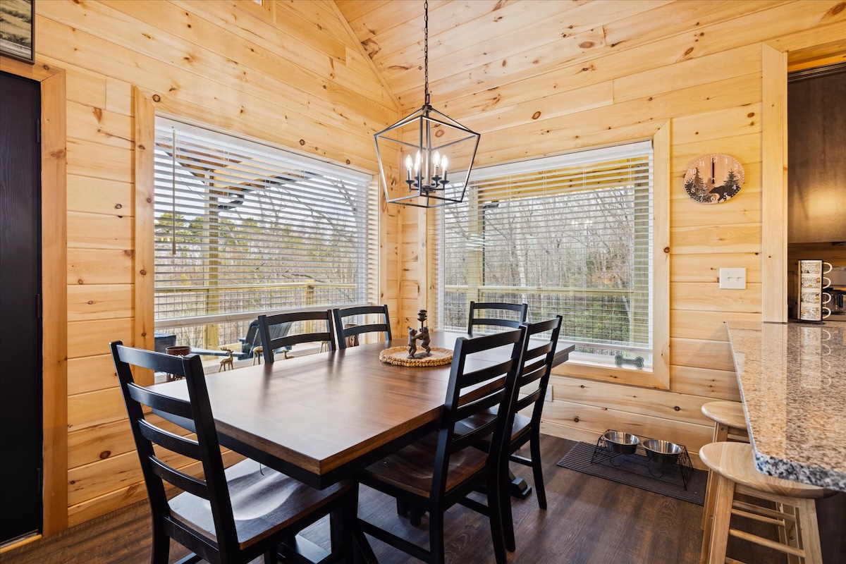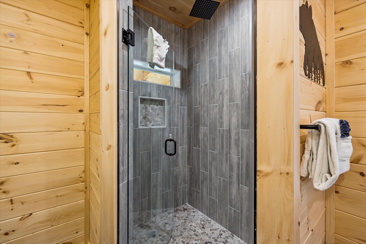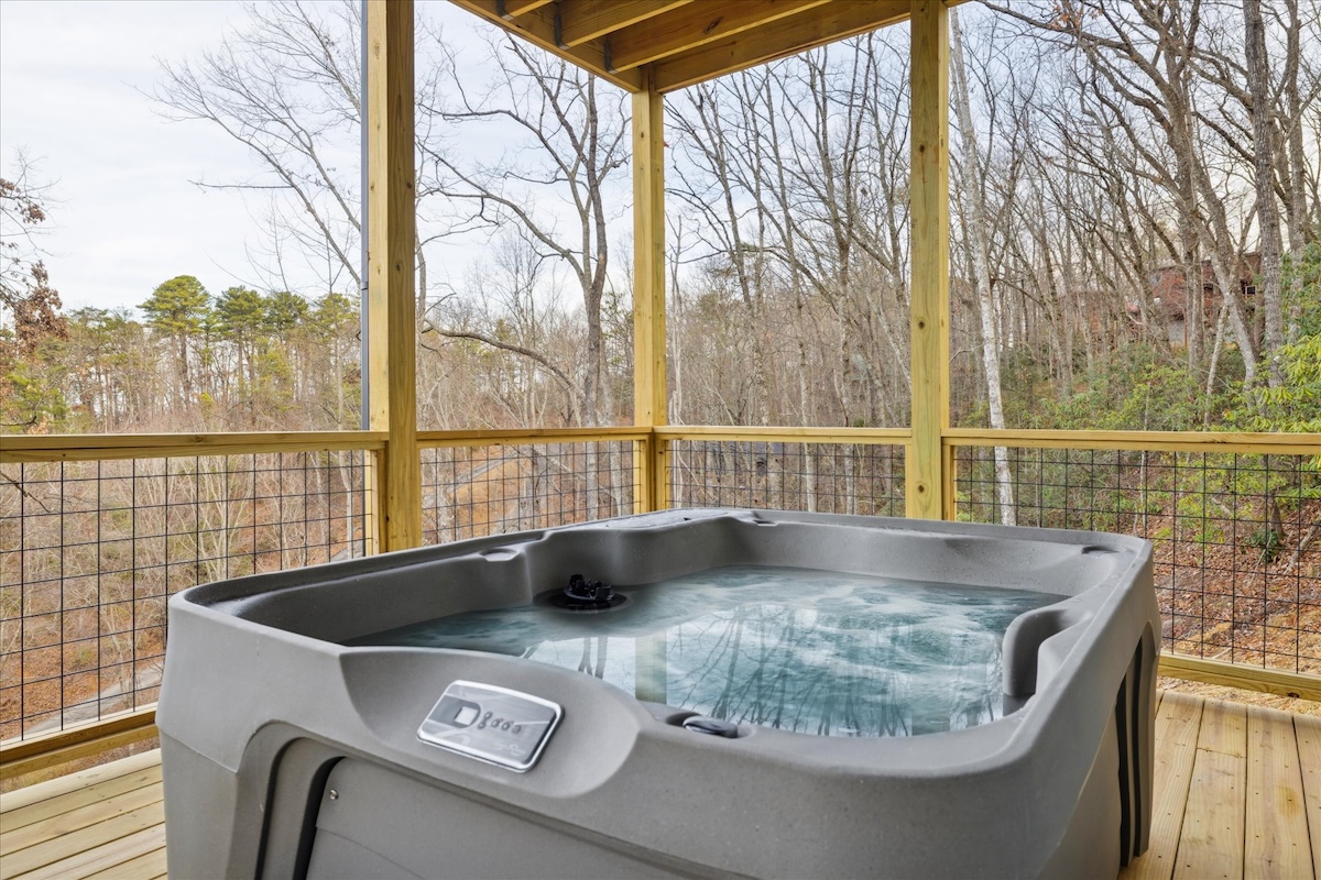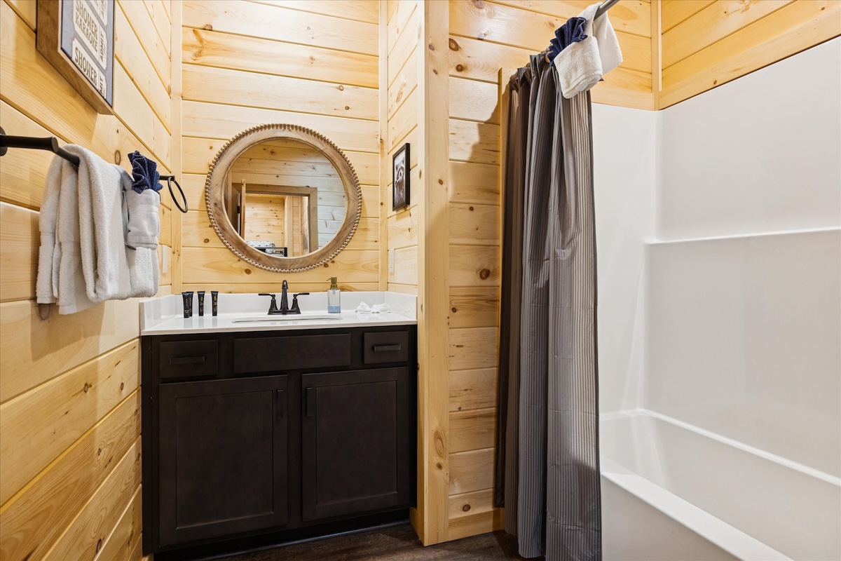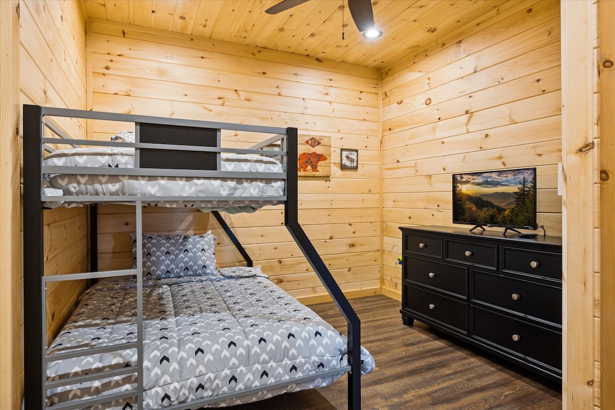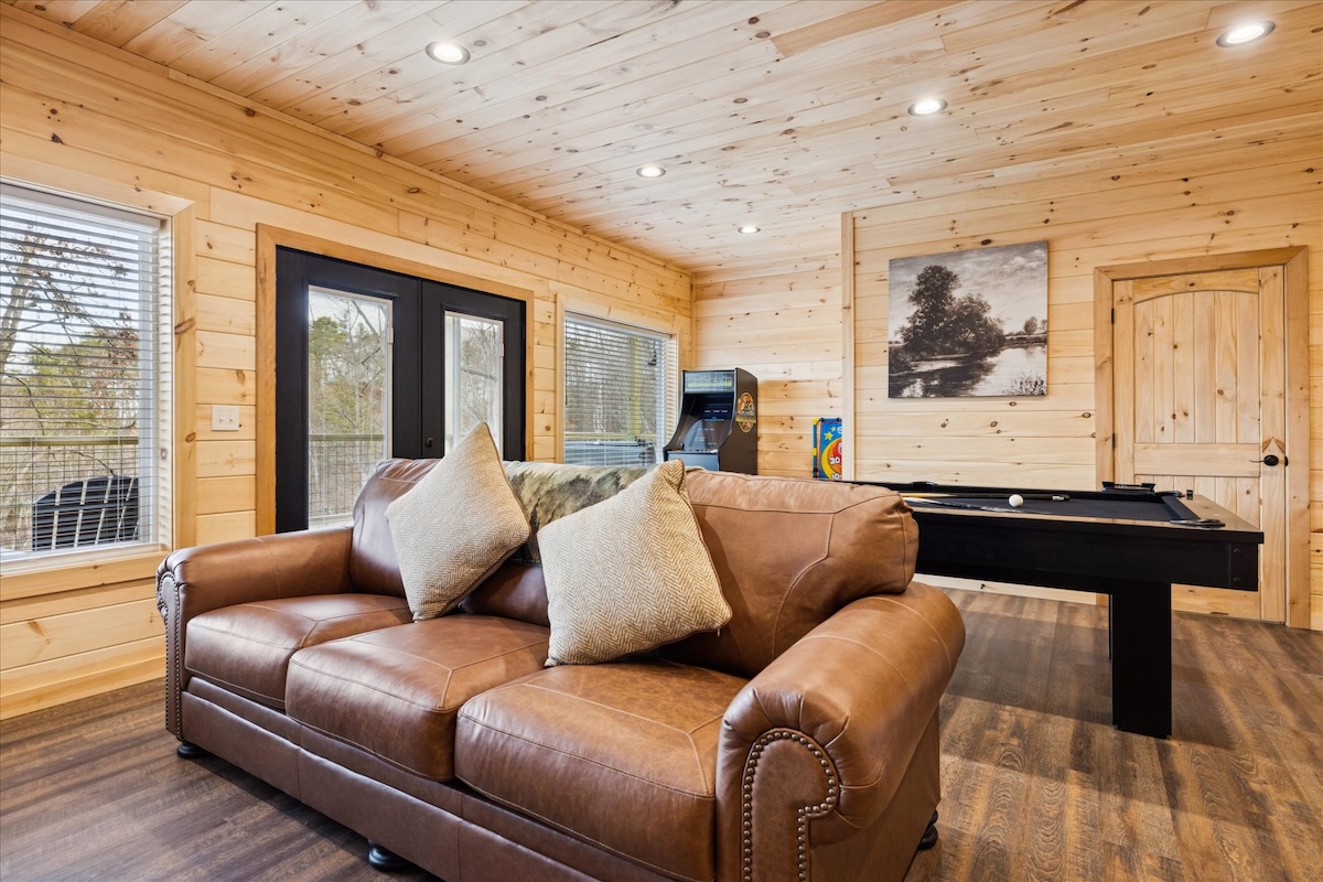 The lower level is designed for fun and relaxation, offering a game room with a pool table, arcade machine, and a second fireplace. This level also includes two additional bedrooms—one with a queen bed and the other with a twin-over-full bunk bed—along with a full bathroom. From the lower deck, guests can unwind in the private hot tub after a day of exploring the area.